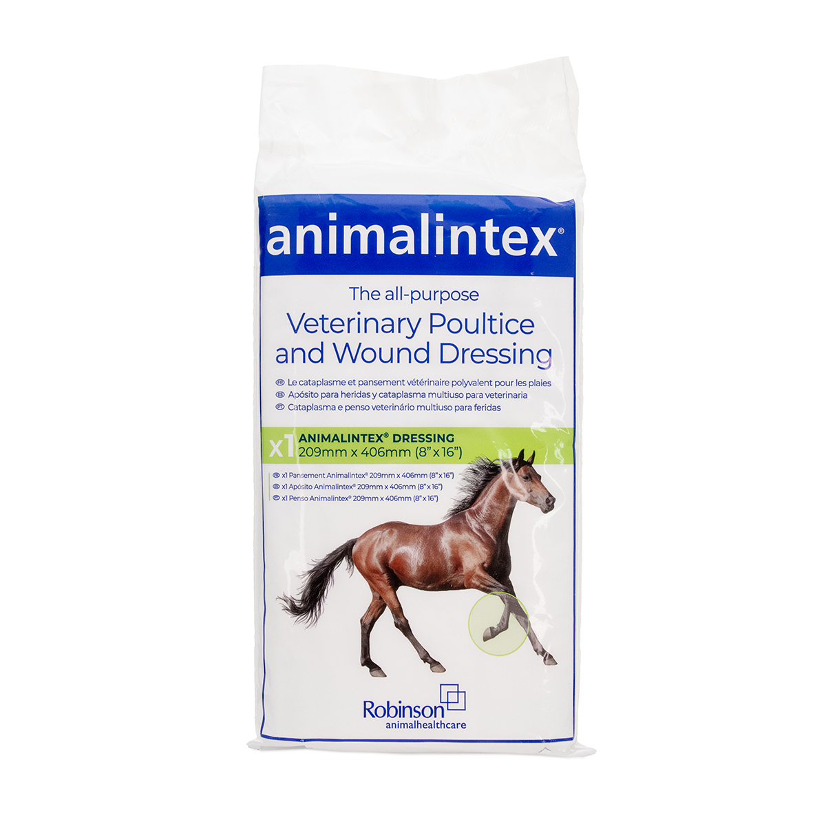 The all-purpose veterinary poultice dressing for use in horses and dogs (unsterile). Animalintex poultice pad can be used either as a hot wet poultice or a cold wet poultice, or as a dry wound dressing. Ingredients: Tragacanth 6.02g/pad, Boric Acid 2.08 g/pad.